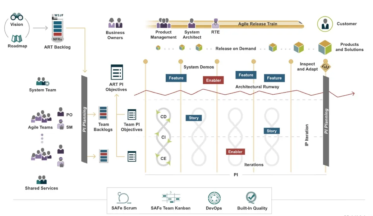- Program Increments (PIs): Fixed 8-12 week planning cycles where teams align on objectives and dependencies