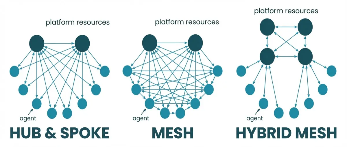 When there are many of them working in a coordinated way, they form a mesh topology. And the complexity of managing them grows exponentially. Besides agents, there are tools (e.g. MCP servers) that agents can use in a many-to-many fashion. In more complex scenarios, we may have a hybrid mesh topology, where platform resources needs to be connected, e.g. LLMs and vector databases.